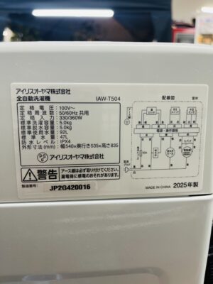 アイリスオーヤマ 洗濯機 IAW-T504 25年製 5.0kg