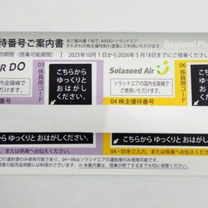 AIR DO(エアドゥ)/ Solaseed Air(ソラシドエア) リージョナルプラスウイングス 株主優待 26.5.18まで 入荷しました